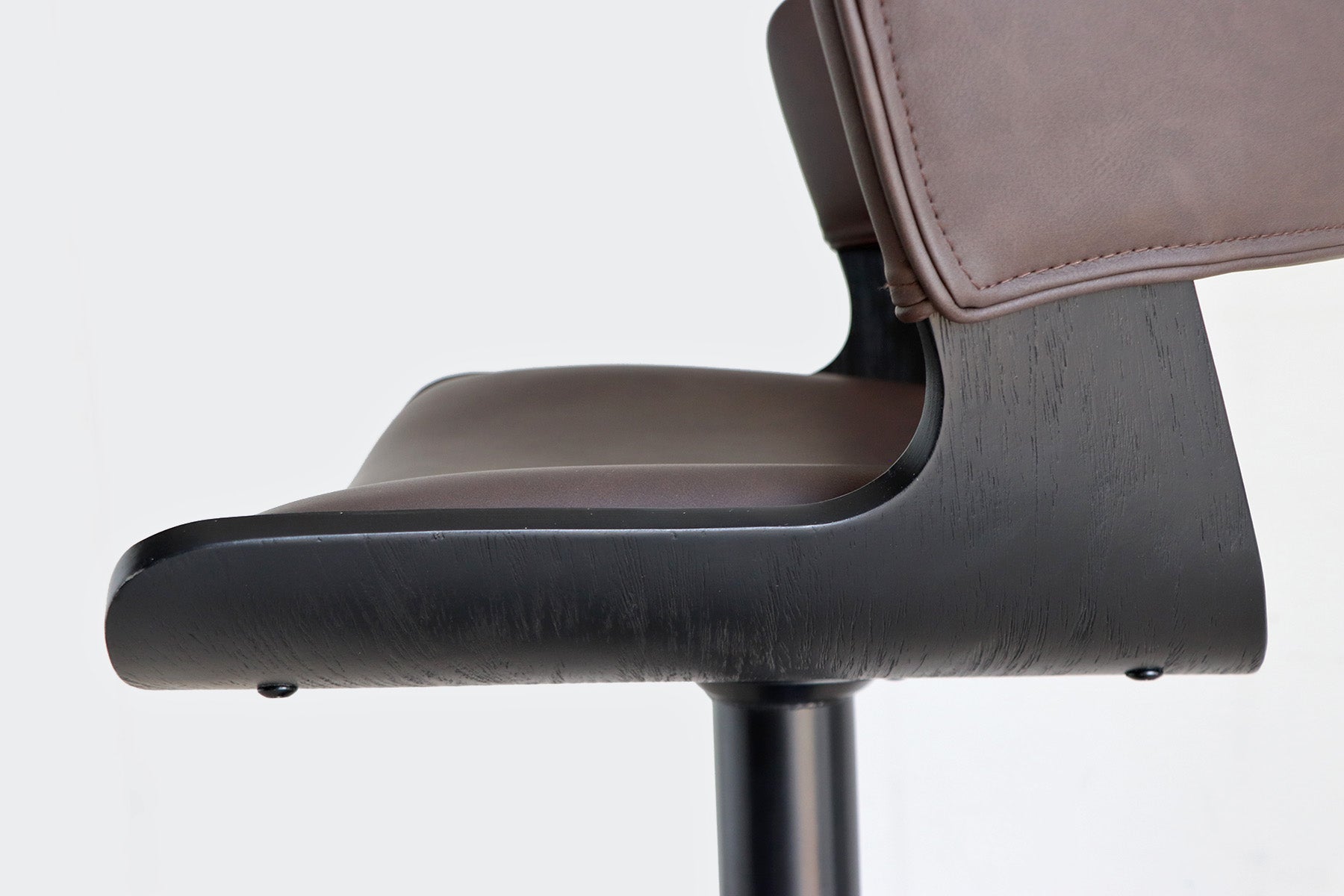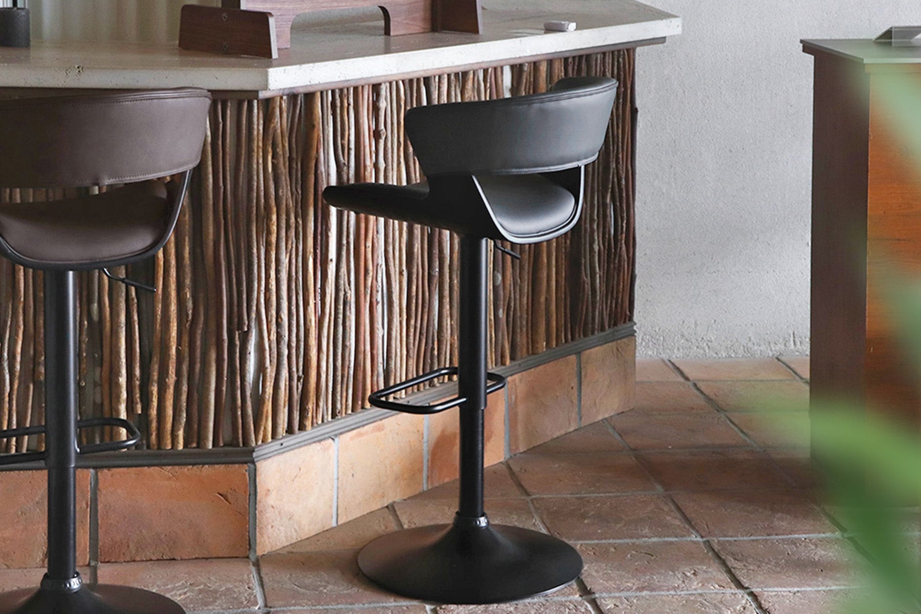 大人ラウンジバーにふさわしい、エレガントで高級感のある佇まいのバーチェア。ディテールにこだわって作っているので足元もスッキリ見えます。無駄のない装飾で、シンプルかつエレガントさを引き立てています。細かなパーツもブラックで統一するこだわりよう。ご自宅のカウンターキッチンやスタンディング式昇降デスク、カフェ空間としてもシックでおしゃれな雰囲気を醸し出します。主張しすぎない色合いとスタイリッシュなデザインが多くの店舗デザインに溶け込むアイテムです。高めに座る座面なので、座り心地には特にこだわりました。座面と背もたれに入ったウレタンフォームで包まれるような座り心地を実現しました。一度座ると立ち上がれなくなるほど心地よいです。暮らしを彩るブラウンカラーと、シックなラウンジにぴったりのブラックカラーの2色展開です。