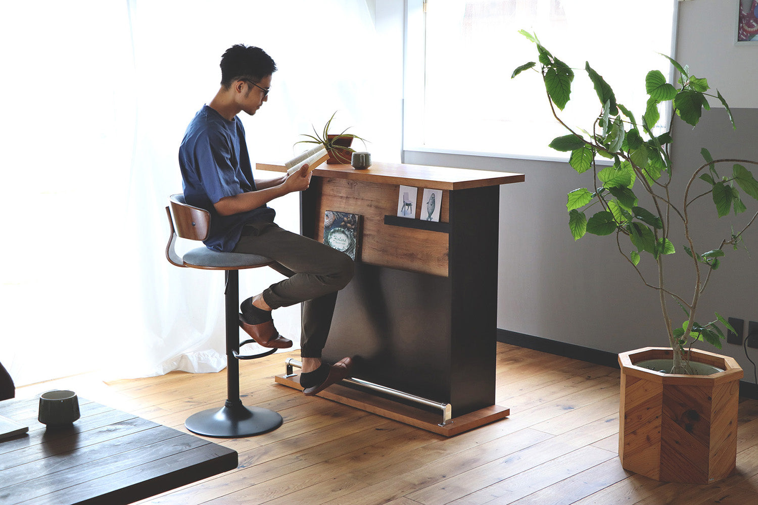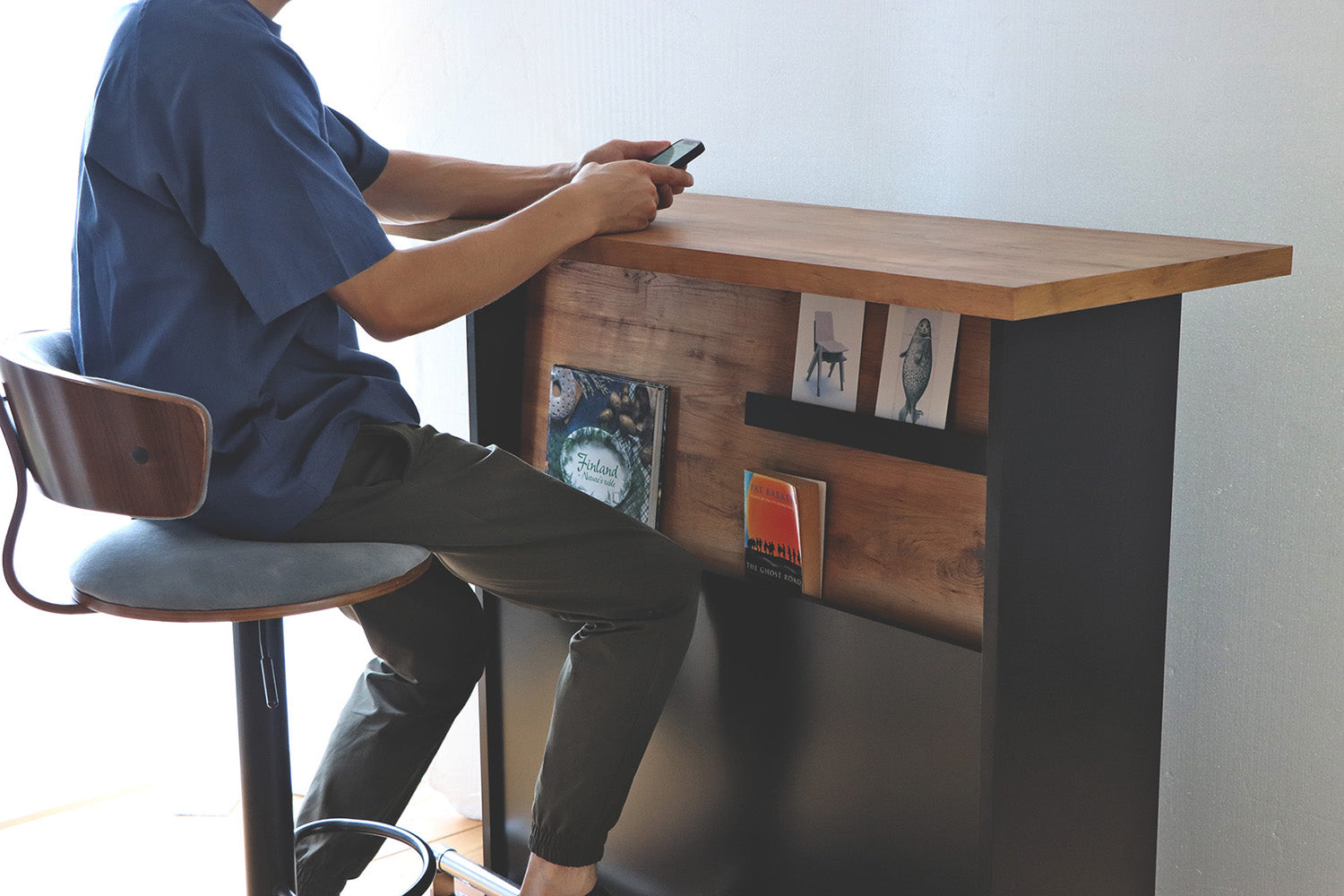 味わい深い木目と黒のラックが雰囲気に映えるカウンター。自宅でもお店に置いても使いやすい丁度良いサイズ感とデザインです。表面はマガジンラックが付いており、背面は大容量収納があるので実用性も抜群です。自宅でもお店に置いても使いやすい丁度良いサイズ感です。カウンター天板の下には、マガジンラックが付いているのでおしゃれに演出できます。足元には、ステンレス製の丈夫な足置きが付いています。お招きしたお客様が楽に座れるようになっています。またデザインのアクセントにもなっています。斜めになっているので少しの揺れでは本や雑誌は落ちないようになっているので安心です。飾り棚としても、お店のチラシなどを置いてもGOOD。