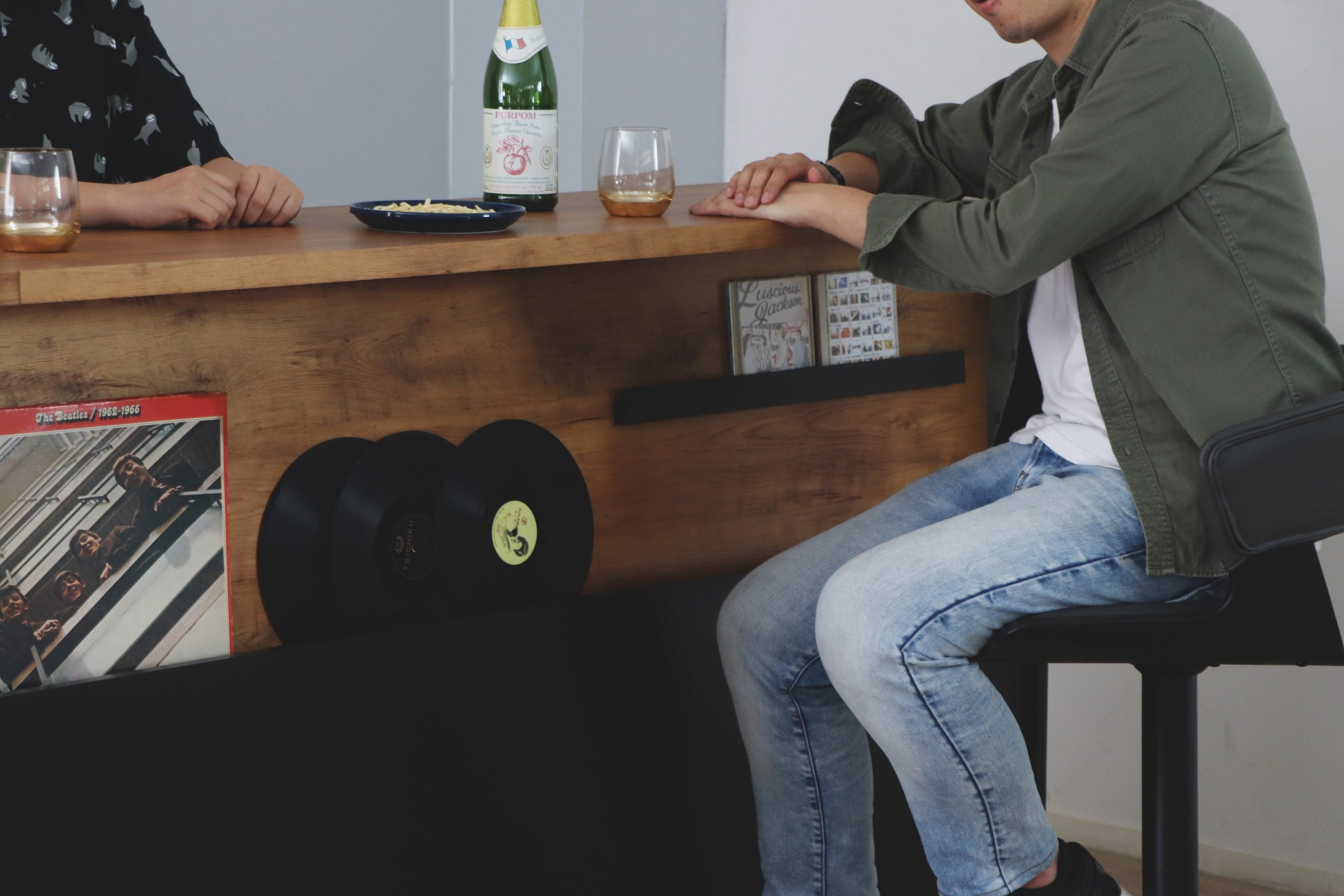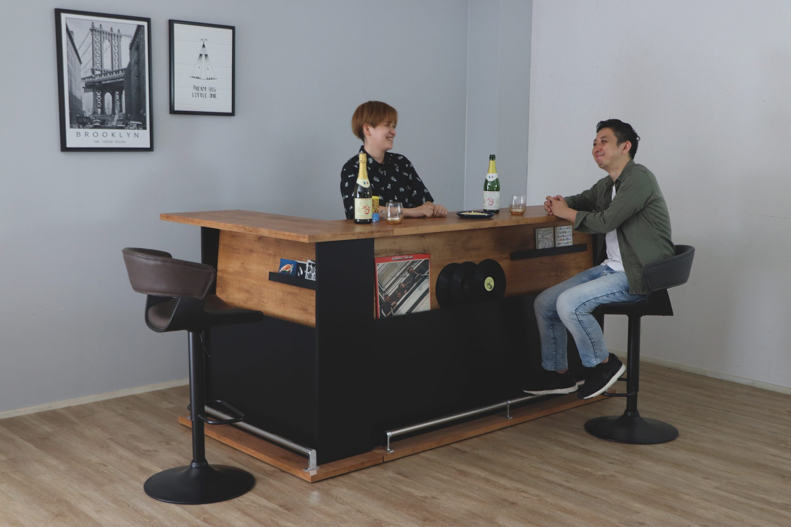 味わい深い木目と黒のラックが雰囲気に映えるカウンター。自宅でもお店に置いても使いやすい丁度良いサイズ感とデザインです。表面はマガジンラックが付いており、背面は大容量収納があるので実用性も抜群です。自宅でもお店に置いても使いやすい丁度良いサイズ感です。カウンター天板の下には、マガジンラックが付いているのでおしゃれに演出できます。足元には、ステンレス製の丈夫な足置きが付いています。お招きしたお客様が楽に座れるようになっています。またデザインのアクセントにもなっています。斜めになっているので少しの揺れでは本や雑誌は落ちないようになっているので安心です。飾り棚としても、お店のチラシなどを置いてもGOOD。