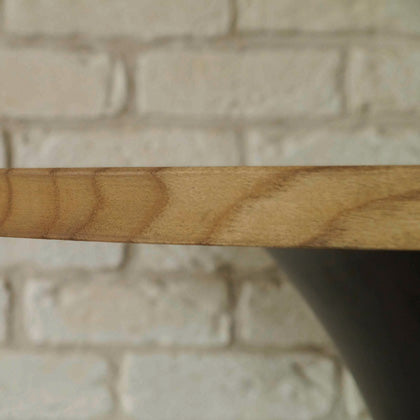 木目や節など、時間の経過を感じさせるモッシュシリーズ。打痕やキズを意図的に加え、経年変化を表現したデザイン家具です。職人が一つ一つ手作業でエイジング加工を施しています。天板のエルム材は、特徴的な木目が美しく、長い間使い込んだ愛着のあるテーブルのような風合いを持ちます。アールを描く存在感のある脚が、モダンな印象を与えています。