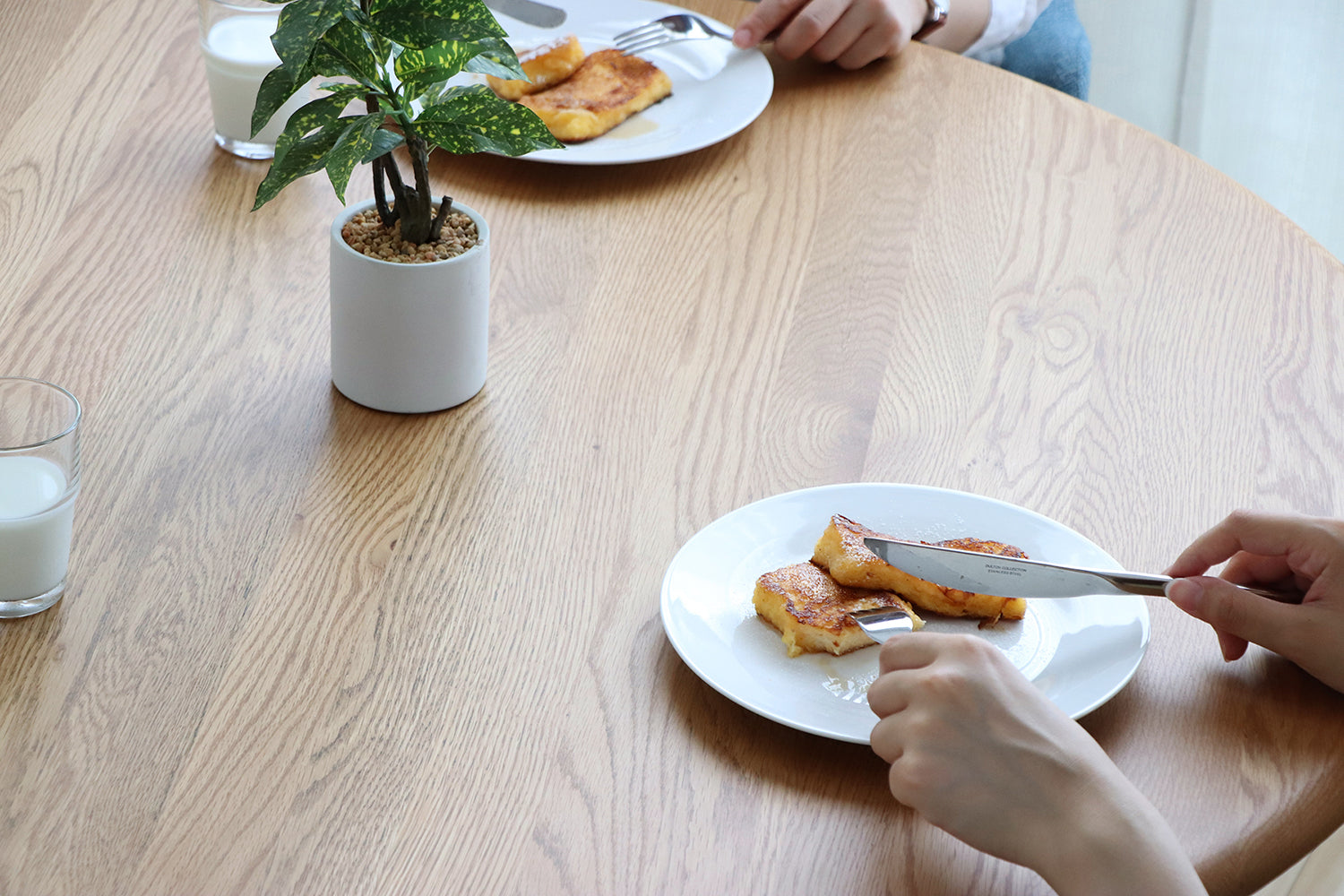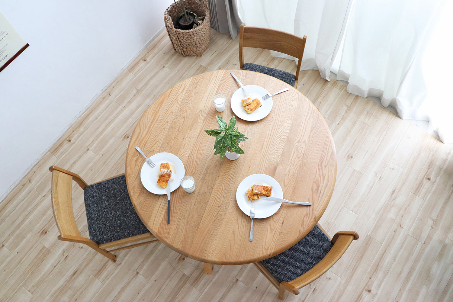 オーク無垢材をふんだんに使った、高級感あるダイニングテーブル。程よい木の質感と綺麗な木目が印象的で、丸みのあるかわいい雰囲気です。天板の縁にも丸みを持たせ、お子様のけがの心配も少ない優しいフォルムに仕上がっています。3本足なのでガタつかず、一人分のスペースも広くゆったりとしています。会話が生まれやすい円形テーブルで、家族団欒の時間が過ごしてみてはいかがでしょうか。同じシリーズのチェアもあります。