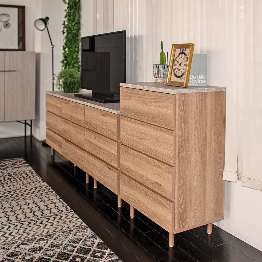 ナチュラルな板目の風合いと石目調のメラミン天板のコントラストで清潔感と可愛らしさを持つドゥ―ロシリーズ。多様なシチュエーションに対応できるように引出の仕様も3種類ラインナップした、使い勝手の良さが際立つチェストシリーズです。
