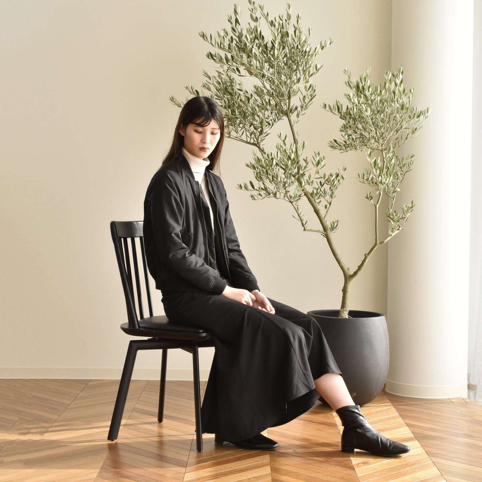 シンプルでシックなデザインが、気品を感じられるブラックチェア。スチールと無垢の木で出来ており、ずっしりと重みがあります。真っ黒で美しい木目とシンプルな形状が、テーブルの美しさを引き立てます。座面が回転して体の向きを変えられるので、テーブルからの椅子の出し引きが不要です。また、座面を回して手を離すとバネのように座面の方向が元の位置に戻ってくれるので便利です。kaguaroo より新たに加えられた「BLACK LABEL」シリーズ。今までのシリーズをブラックをベースにデザインすることで、気品を感じられるテイストに仕上げられています。