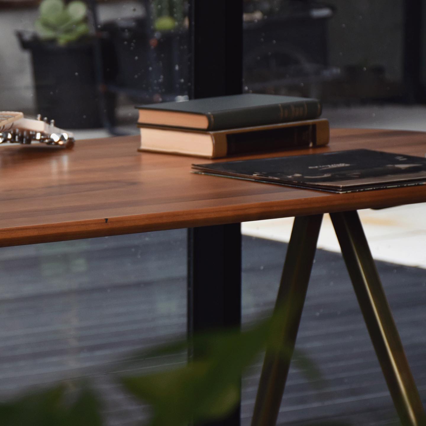 真鍮カラーの脚とアシンメトリー形状の天板が調和した美しいデザインのテーブルです。天板はウォールナット無垢材を使用、角は柔らかく丸みを帯びさせることで、全体的にヴィンテージなテイストに仕上げました。※無垢材天板は模様・形状がハンドメイドのため1点1点異なります。また脚部はムラ感を出したヴィンテージテイストの塗装となります。