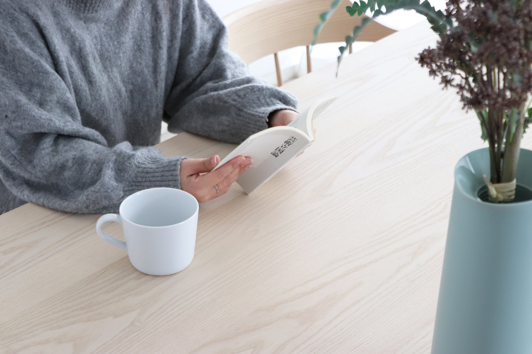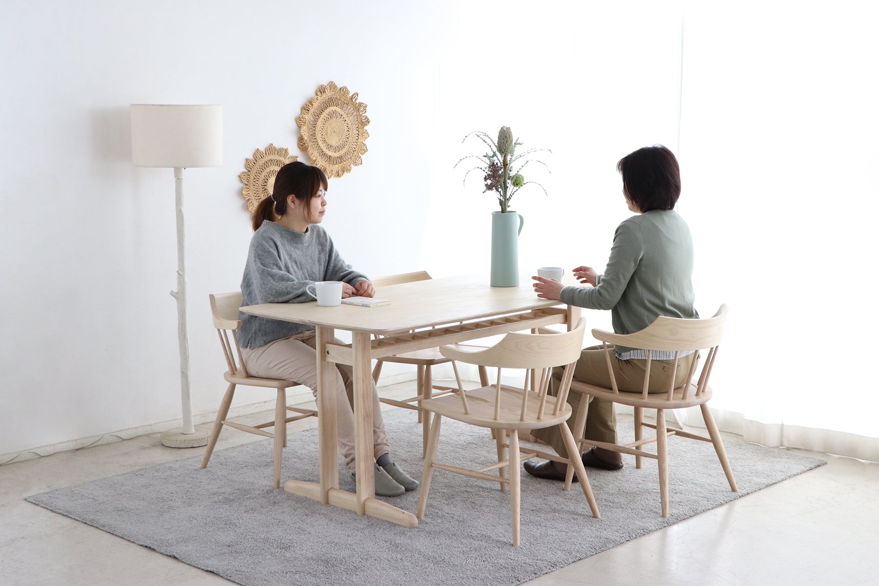 ミルキーホワイトのカラーリングに、アッシュ無垢の質感がおしゃれなダイニングテーブル。明るく清涼感のある佇まいは、お部屋の質を上げてスッキリとした印象に仕上げてくれます。天板下にはリモコンやカトラリー箱などが置ける小さな棚が付いているので、散らかりがちなテーブルの上もサッと片付けられます。また、テーブルの脚は中央に設計されているので、座る時の出入りが簡単なのもポイント。北欧風の爽やかなお部屋が簡単に仕上がるので、インテリア初心者の方でも理想のお部屋がコーディネートできます。