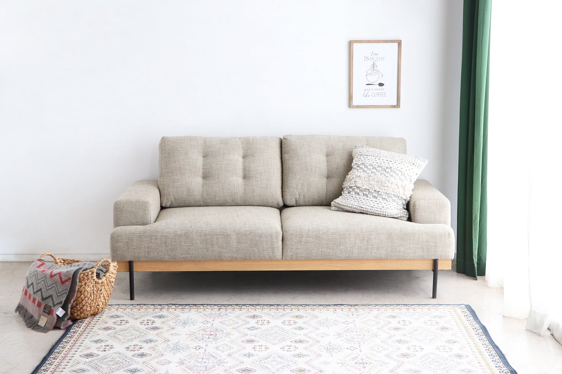 シンプルなデザインと上質な生地の質感が魅力のカジュアルソファです。木目とスチール脚のアクセントが絶妙に調和し、バランスの取れた仕上がりとなっています。コンパクトな暮らしにゆとりをもたらす、このソファでリラックスした時間をお過ごしください。