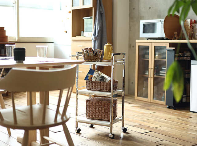 サイズバリエーションが豊富なので、ソファやローテーブルのサイドなどに場所をとらずに置けて重宝します。移動に便利なキャスター付き。ストッパー付きなので固定もできます。転び止めにもなるサイドバーは持ち手としても大変便利です。移棚板はポリエステル塗装を施し、耐摩耗性や耐久性にも優れてます。