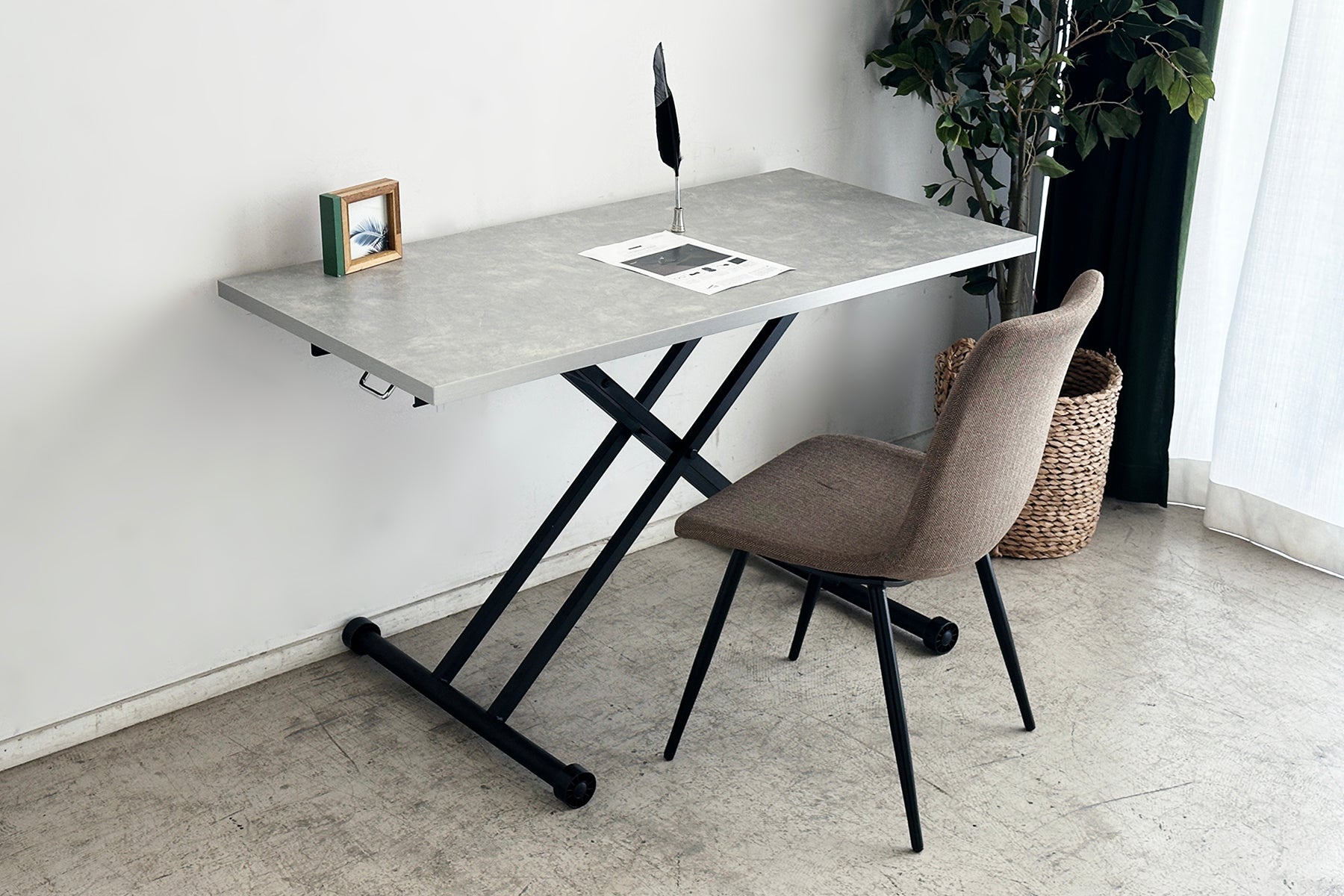 まるでコンクリートでできたかのような、洗練されたデザインの昇降テーブル。ライトグレーの石目模様が特徴的な天板は、高級感を演出しながら汚れが目立ちにくく、日常使いに便利です。リビングテーブルやデスク、ダイニングテーブルの補助台として、さまざまなシーンで活躍します。シンプルでありながら、空間にモダンな雰囲気を加えることができる一台です。