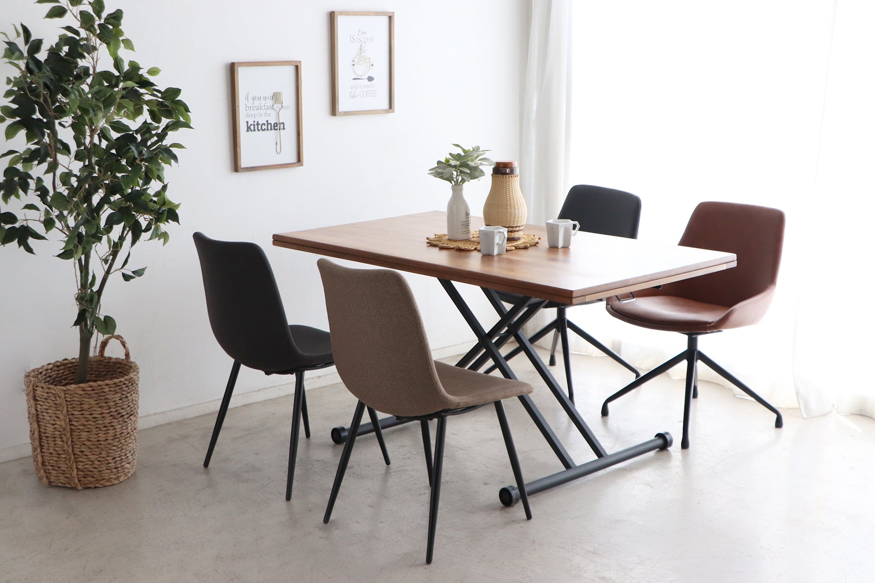 厚みのある3種の無垢材を使った天板に昇降機能がついた唯一無二のテーブルです。ハックベリー、レッドオーク、バーチの3種類の無垢をミックスした他にない天板がこれまでにない雰囲気を出してくれます。2つのサイズ展開で、さまざまなシーンで活用できます。また、無段階で高さ調整できるので、子どもでも大人でも自分だけのちょうど良い高さでお使いいただけます。