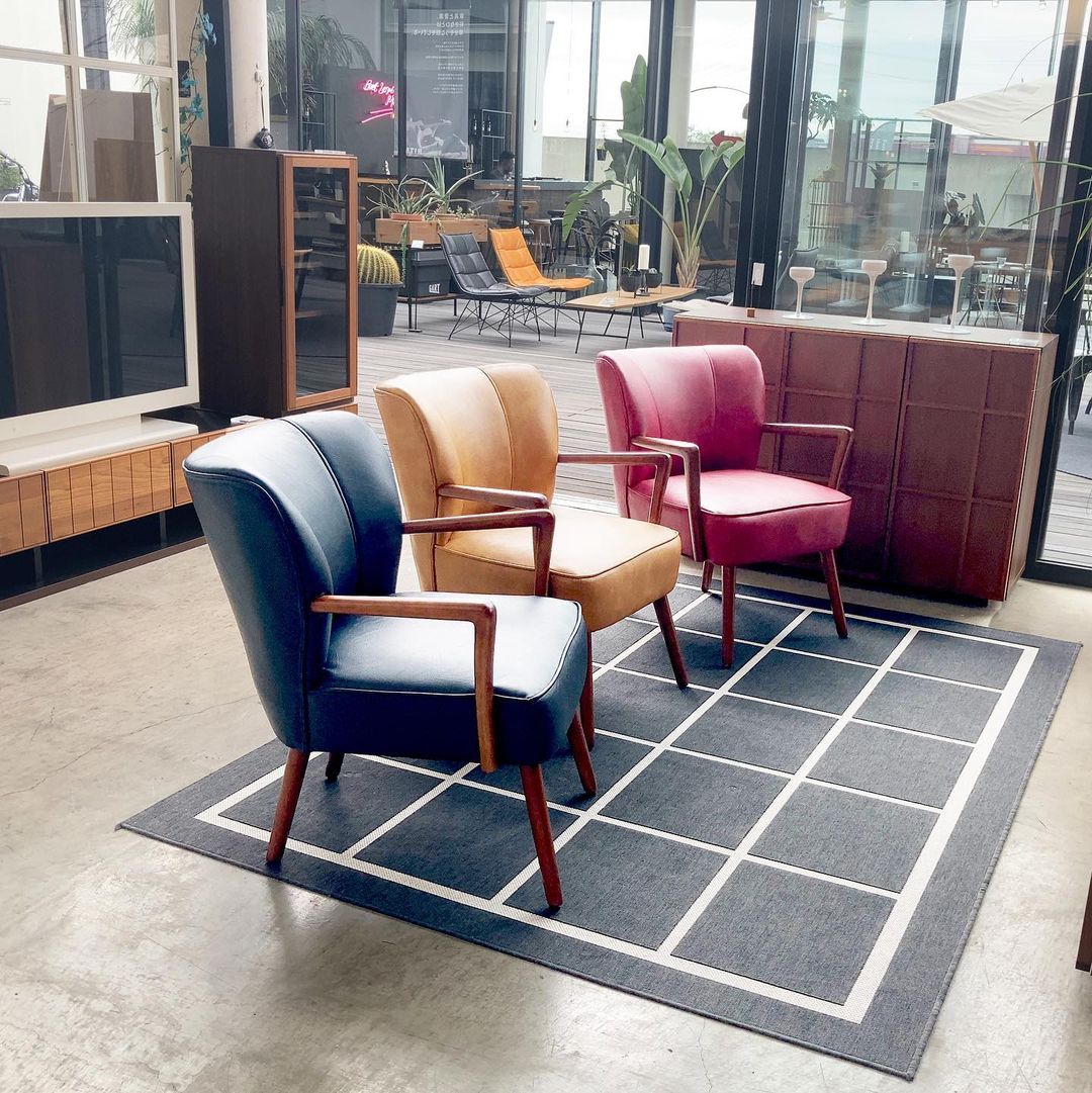 シートのポップなカラーリングと木部のウォールナット色のコントラストが印象的なチェア。味わいのあるレザーと木部の趣ある表情は、どこか懐かしさを感じさせる仕上がりです。様々なシーンにアクセントを加える三色をラインナップしました。