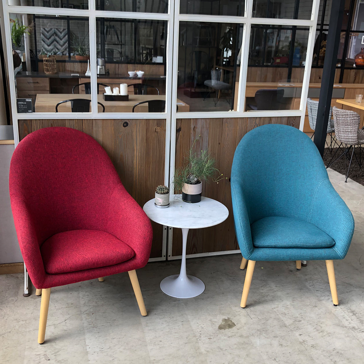 丸みのある本体に、スリムで細いナチュラルの木脚がお部屋をすっきりと軽やかに見せてくれます。カラーは南国の海を思わせるブルーと格調の高さが漂うレッドの2色展開。ダイニングチェア程の座面高がありますので、長時間座っても疲れにくく、テーブルと合わせてダイニングシーンでもお使いいただけます。