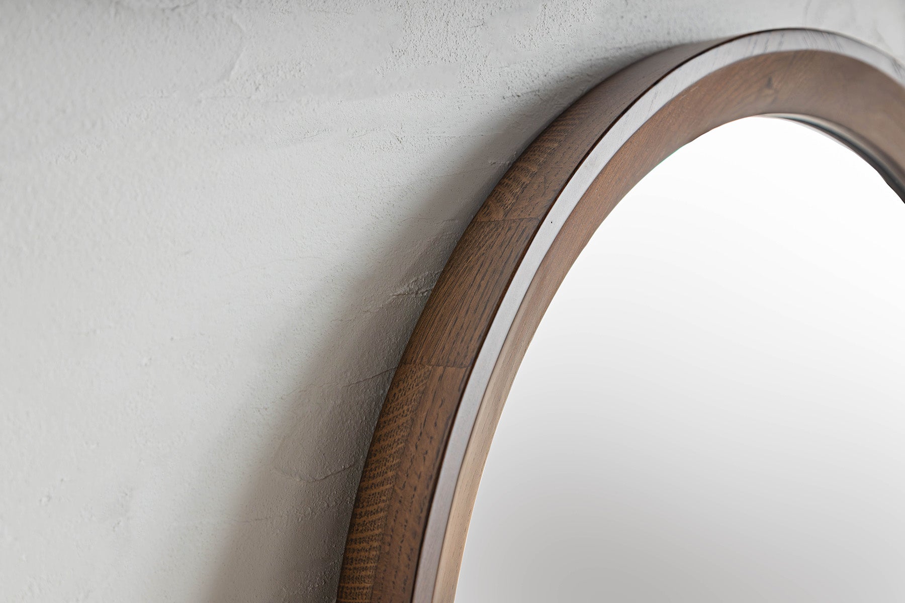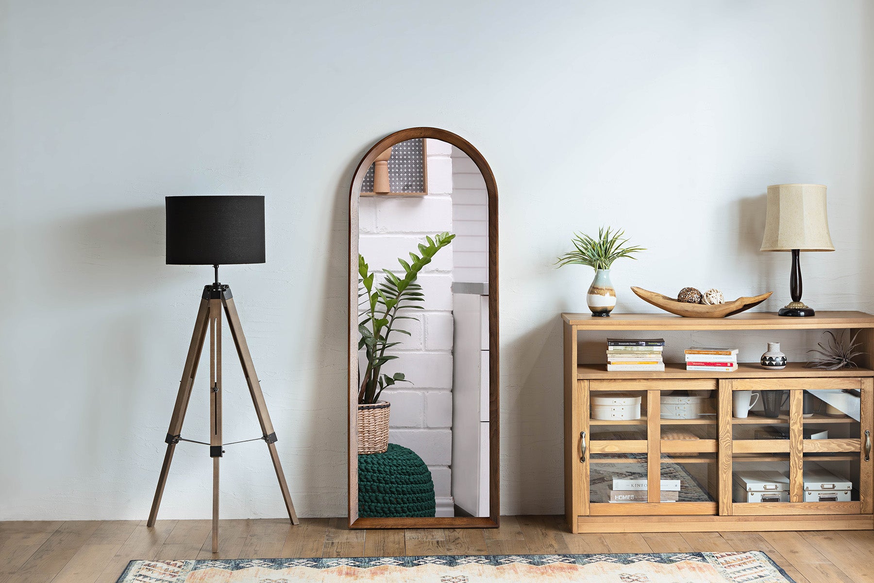 ブラウンの木目フレームが落ち着いた温もりを演出するミラー。丸みのあるフォルムが空間に柔らかさを与えつつ、お部屋を広く見せる効果も。程よいサイズ感で圧迫感を感じさせず、リビングや玄関、寝室など様々な場所に自然に馴染みます。壁に立てかけて使用すれば背の高い方でも全身をしっかり確認可能で、出かける前の身支度にもぴったり。シンプルなインテリアや観葉植物と合わせれば、洗練された空間が完成します。