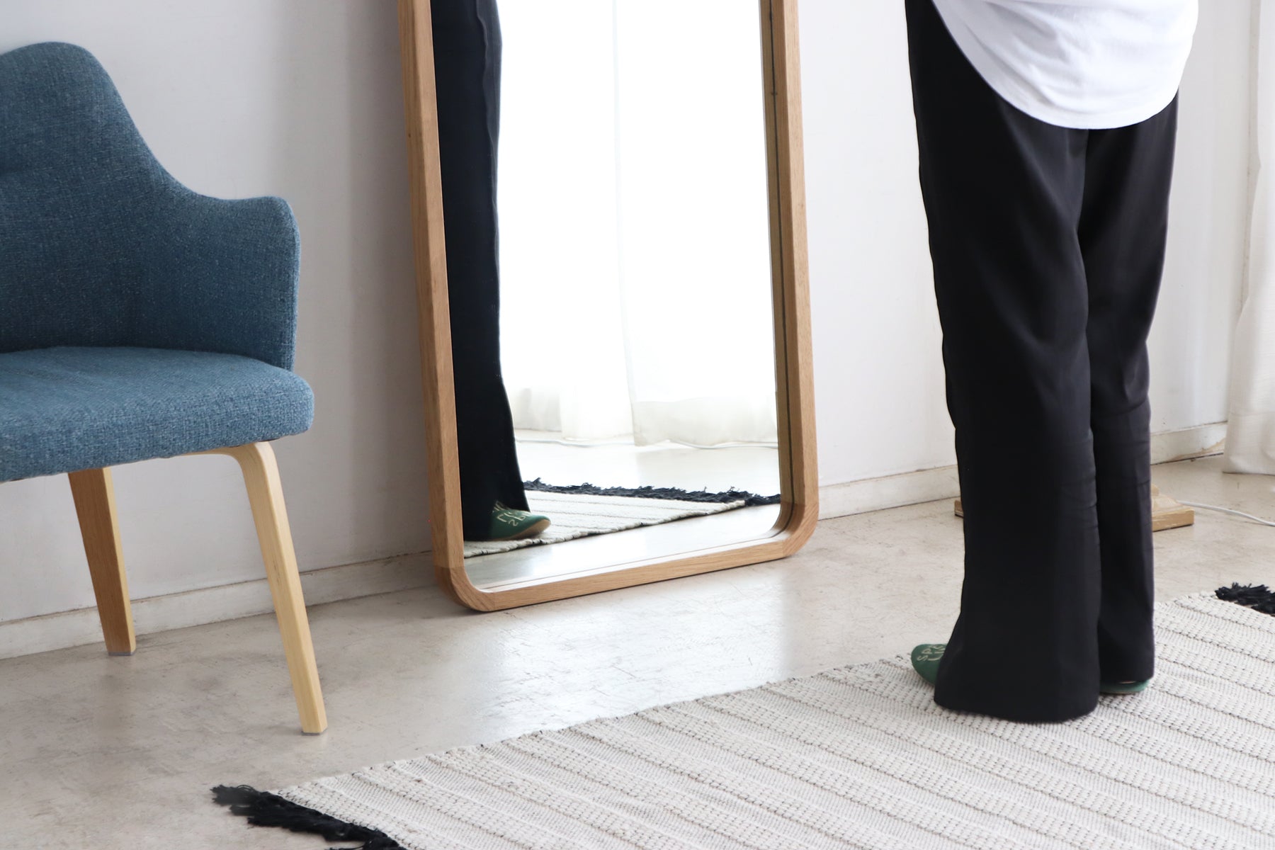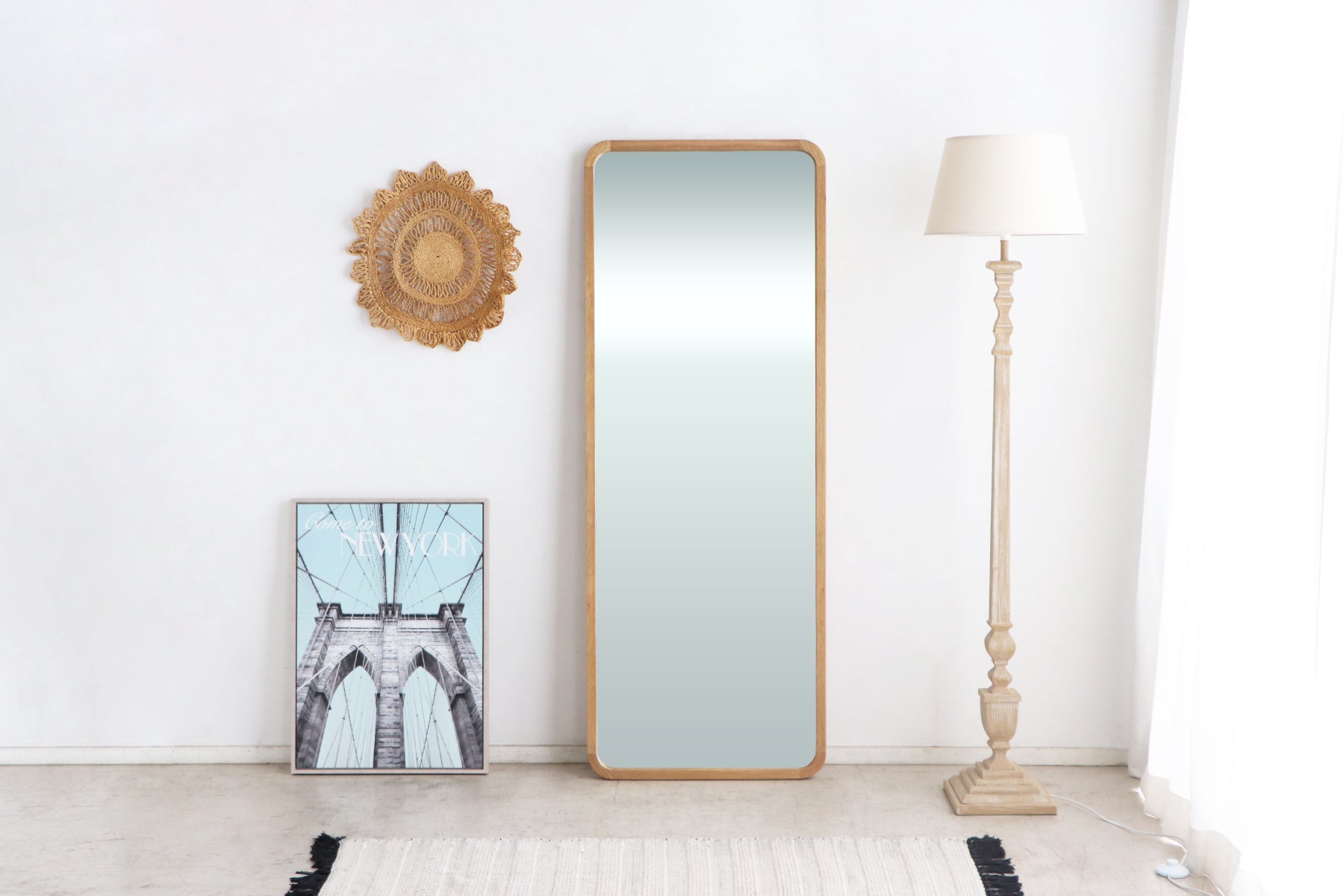 温かみのある木目のフレームとナチュラルな色合いが、爽やかで明るい雰囲気をお部屋に演出するミラー。程よいサイズ感で圧迫感がなく、リビングや寝室、玄関など様々な空間に自然と馴染みます。壁に立てかけて使えば背の高い方でも快適に使え、出かける前の身支度にもぴったり。観葉植物やシンプルなインテリアと合わせて、洗練されたおしゃれな空間をお楽しみください。