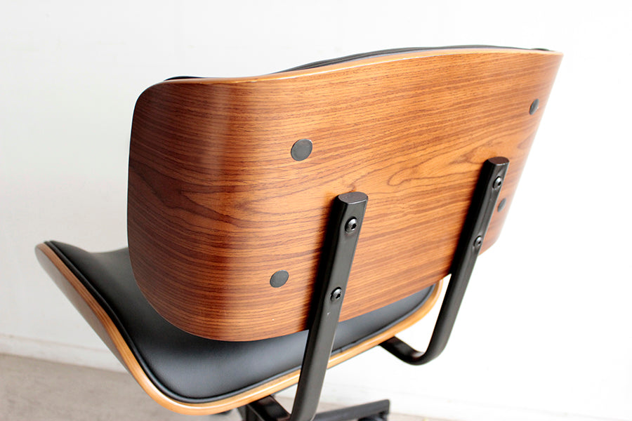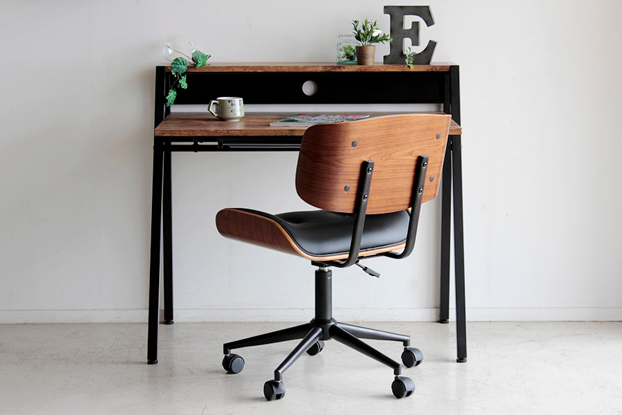 丸みを帯びた曲木とツヤのある黒の合成皮革を組み合わせたことで、モダンレトロなデザインのオフィスチェアが完成しました。座面と背もたれはほどよい硬さのクッション性を持ち、身体をしっかりと支えながらも、背もたれのしなやかなフォルムの曲木が体を優しく包み込みます。曲木の曲線美と合成皮革の質感が融合し、洗練された雰囲気を醸し出します。
