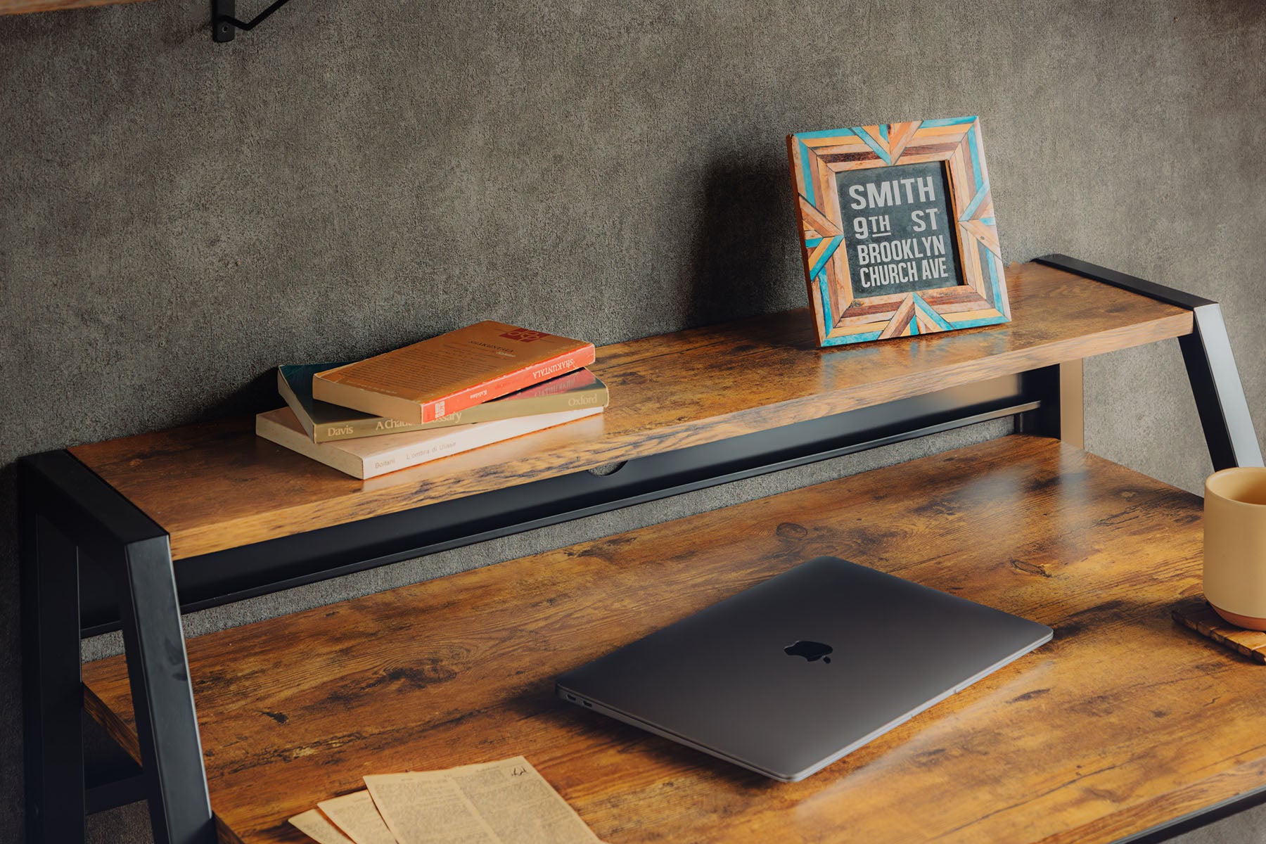デスクに2段目の小棚がついているので、書籍や文房具の収納に便利!さらにお気に入りの小物を飾ることでディスプレイも楽しめます。