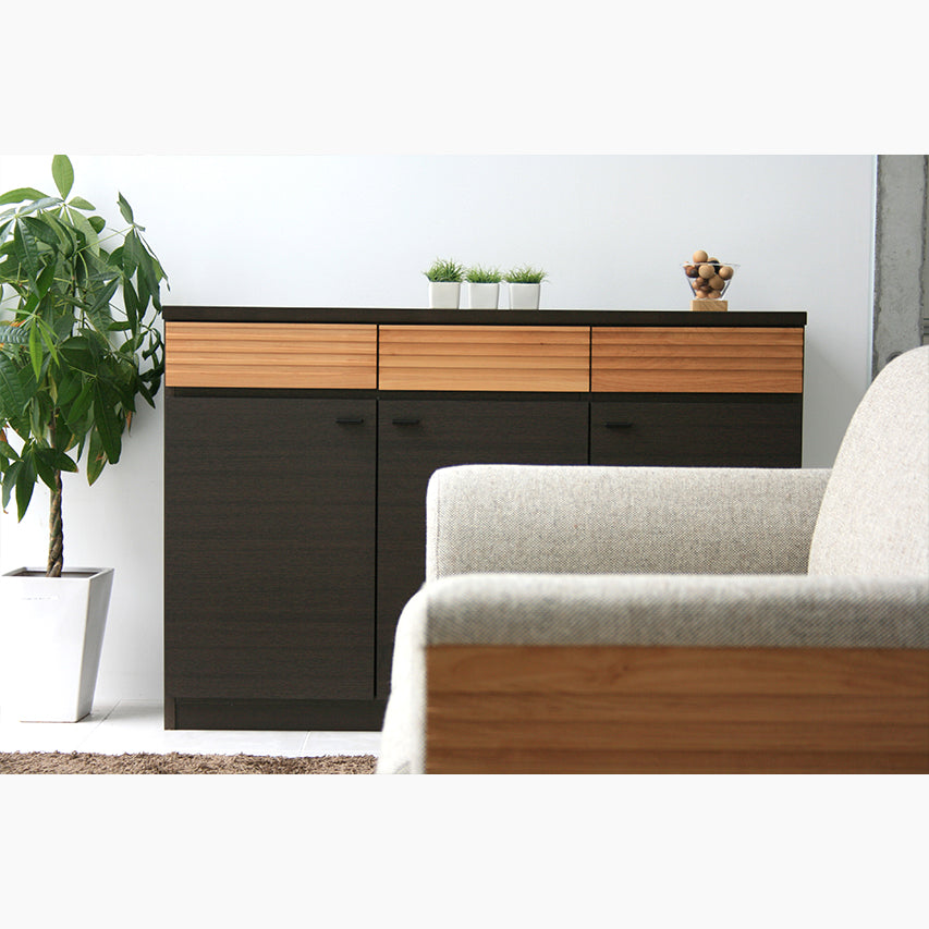 空間を引き締めるダークブラウンの本体に、直線的なルーバー加工を施した天然アルダー材のトッピング。奥行350mmという必要最小限のサイズですので、リビング、ダイニング、書斎など、どこでも圧迫感なくご使用いただけます。デザインを愉しむ、ゆとりのある空間を。