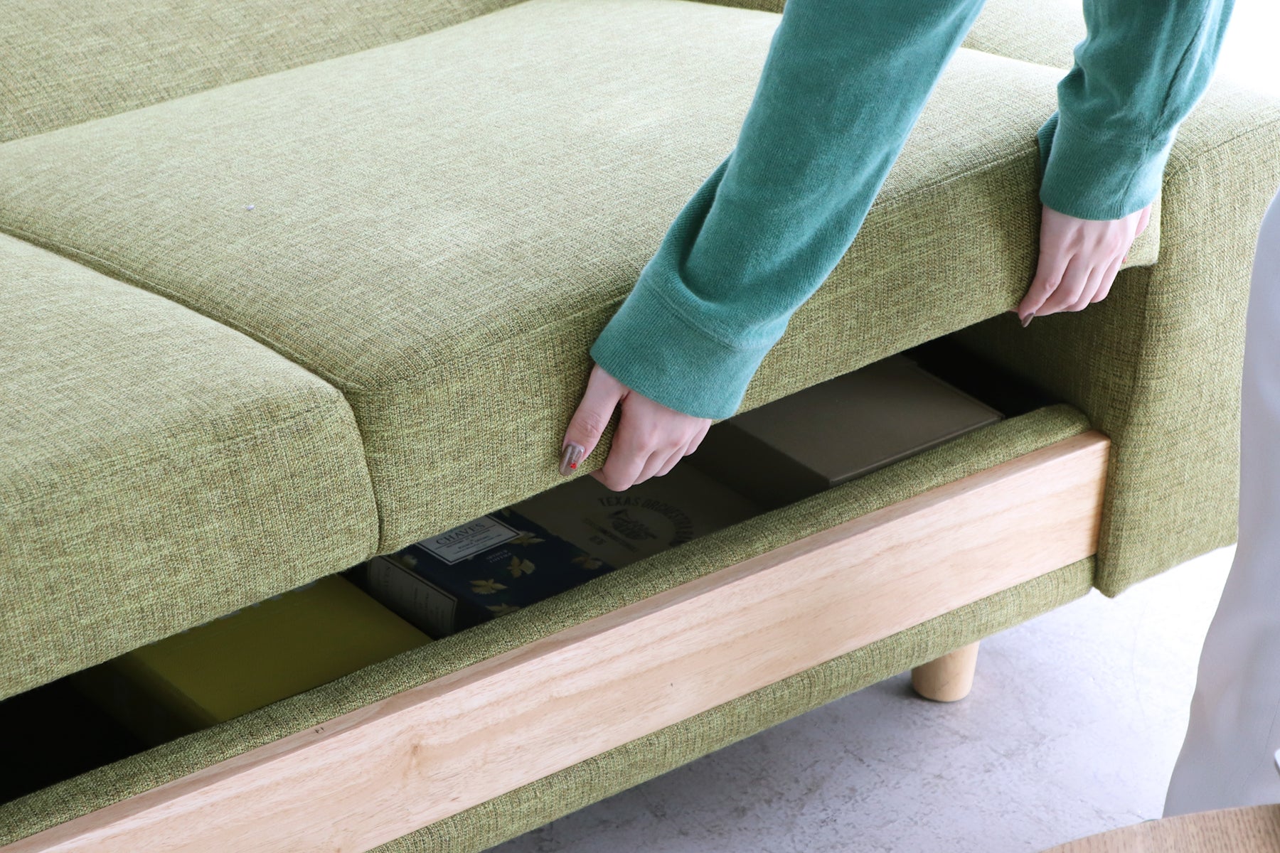 こちらのソファベッドは、座面の裏に広々とした大容量収納スペースを完備しています。ソファとしての快適さとベッドとしての贅沢さを両立し、さらに収納力も兼ね備えたアイテムです。座面の裏の収納スペースはブランケットやクッションなどをすっきりと収納でき、リビングを美しく整えます。