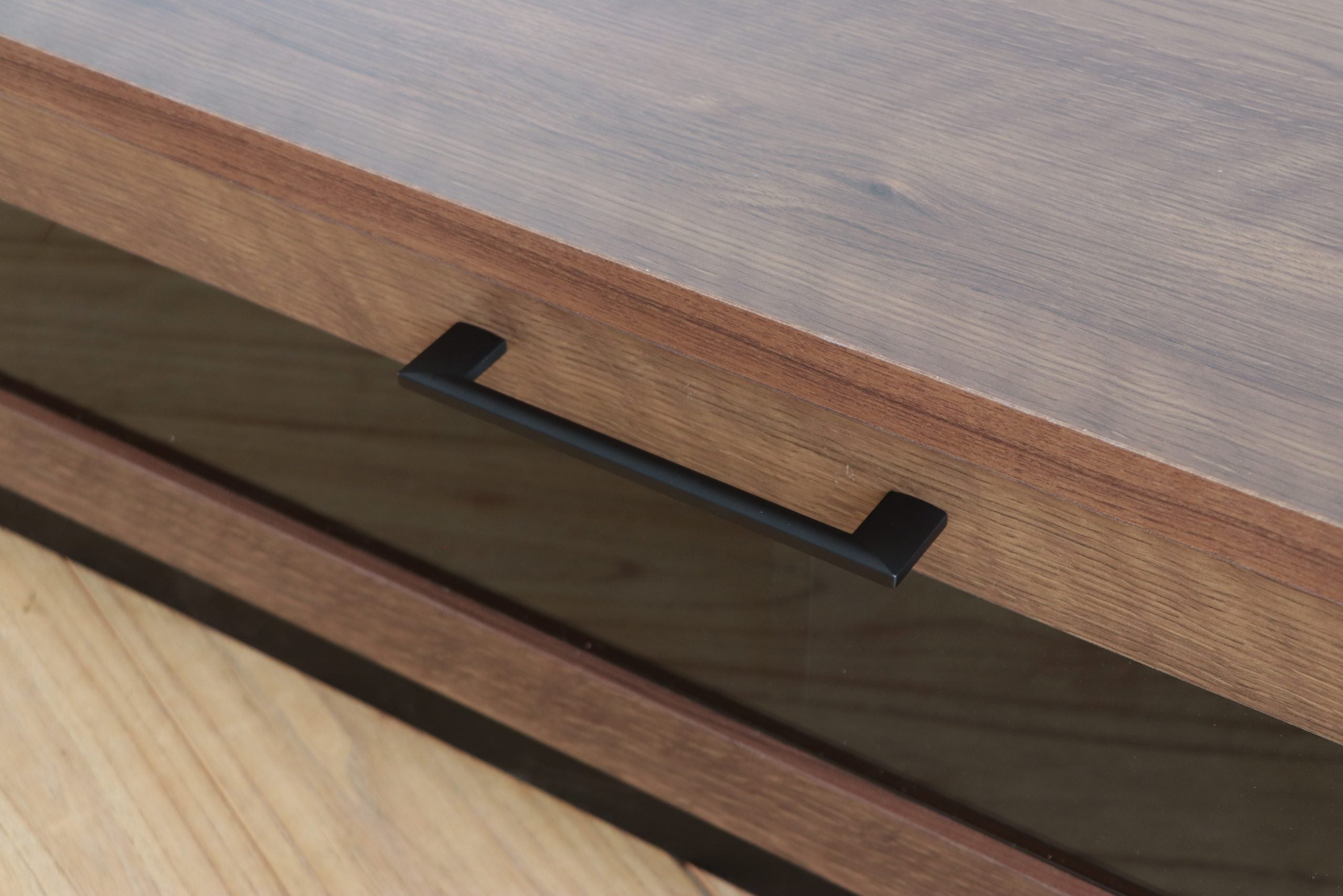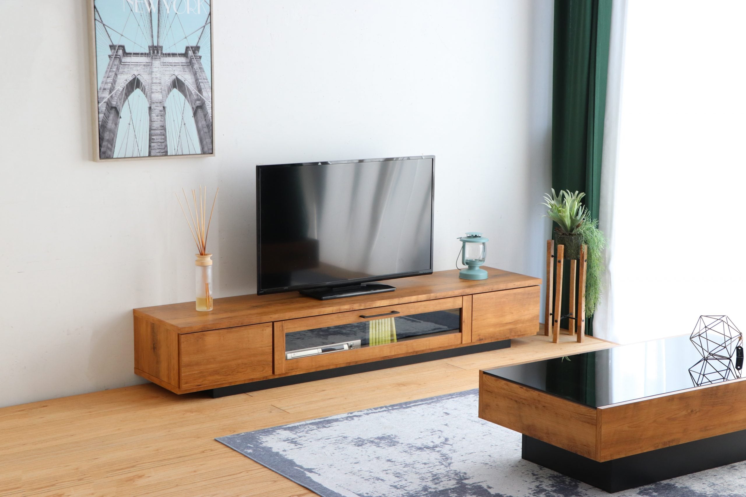 シンプルで洗練されたデザインを活かすため、テレビボードの上には大きな装飾は控えめにするのがおすすめ。小ぶりな観葉植物やお気に入りのオブジェを1〜2点添えることで、スタイリッシュな空間が完成します。