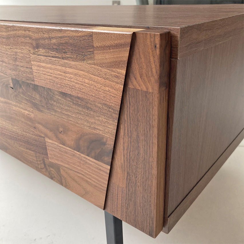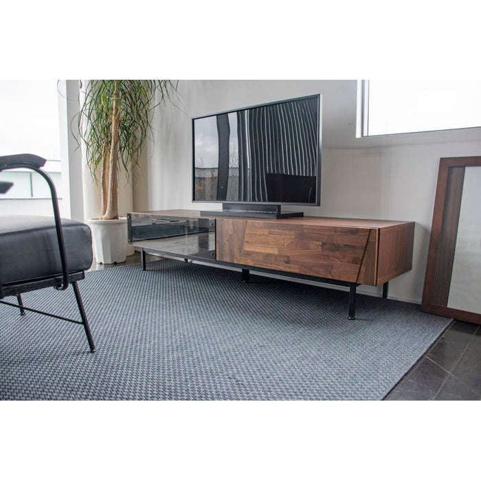 見事なまでに形成された前板のデザインが美しいテレビボードです。前板は繊細に組み替えて形成されており、職人のこだわりが込められたデザインになっています。ウォールナット無垢のあたたかみのある中にも、上品な空間を演出しています。高さも低めの設計なので、お部屋に圧迫感を与えません。
