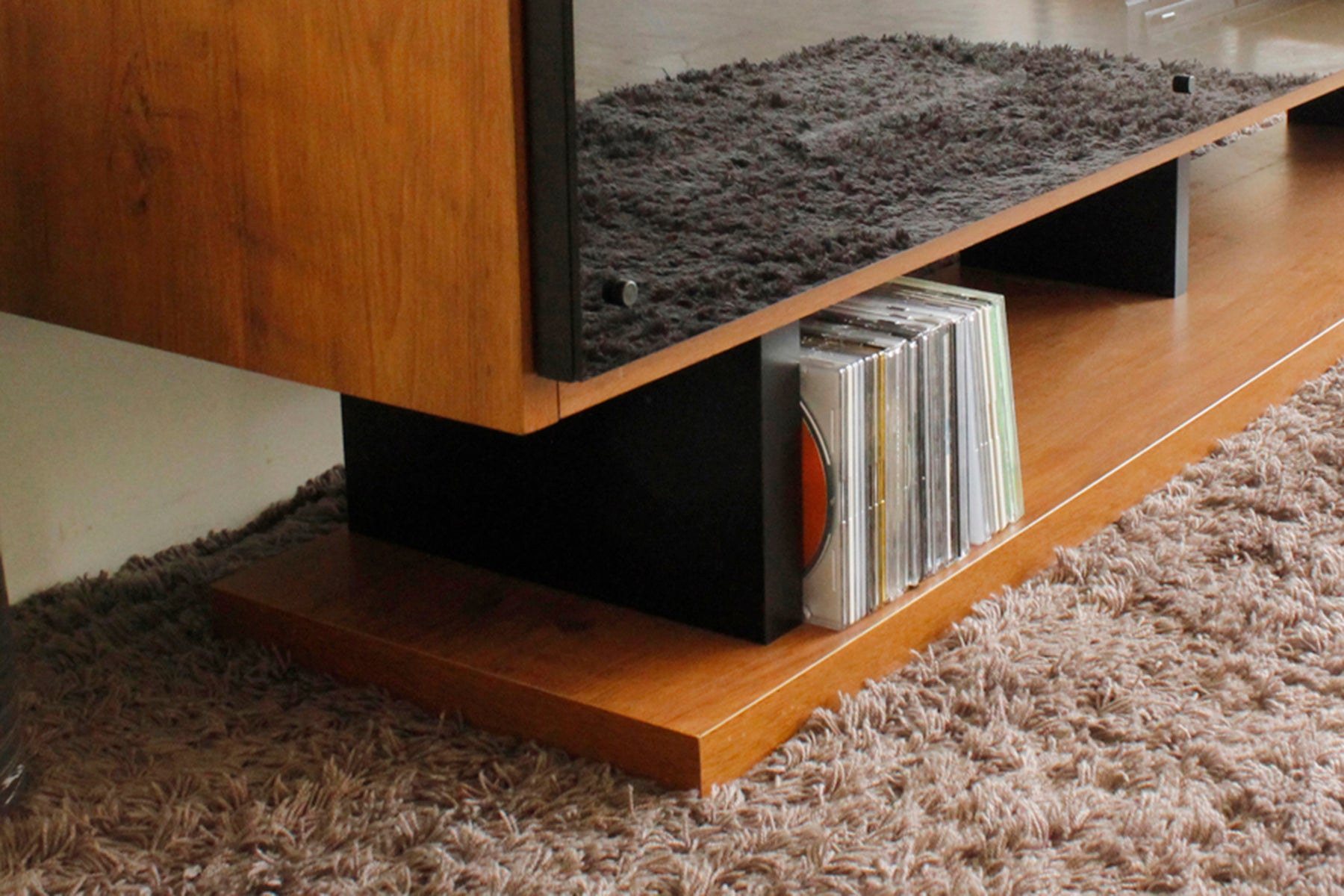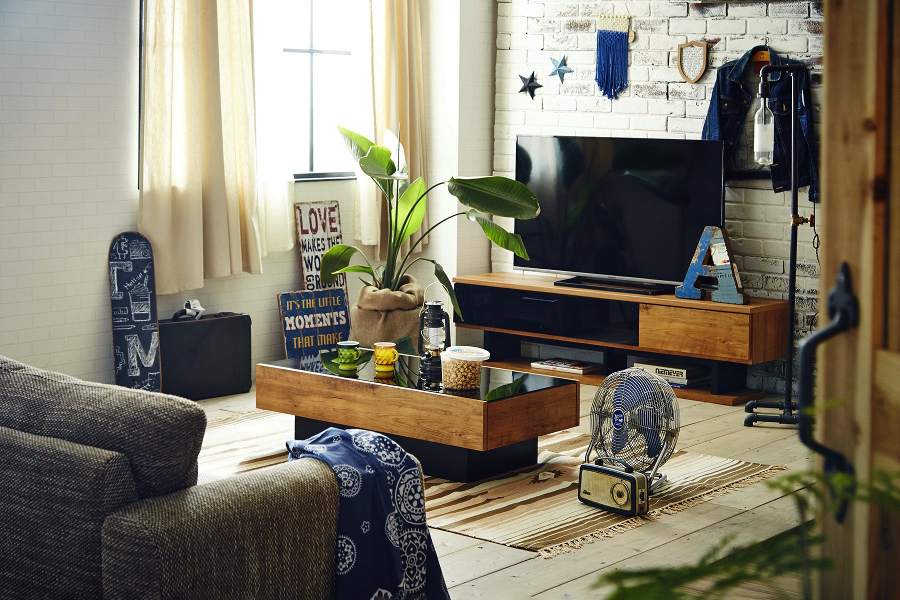ヴィンテージ調の木目がテレビボード。下台には流行のサウンドバー型の横長スピーカーを設置することができ、空いたスペースにはDVD・CDをぴったり収納も可。また下台のサイドや奥部分のスペースには、意外と場所を取る「電源タップ」を目立たないように配置できます。もちろん、録画機器・AV機器等の配線コードも裏側に。TV周りをスッキリ快適にしてくれる多機能テレビボードです。
