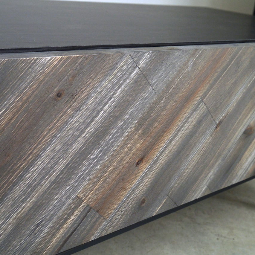 ヘリンボーン調に敷き詰められ無垢材とスチール脚が上品なテレビボードです。前板はアカシアの無垢材を木目の立体感を出すため浮造り加工を施しています。ガラス扉はダークグレーガラスを採用し全体的にシックな印象にまとめました。
