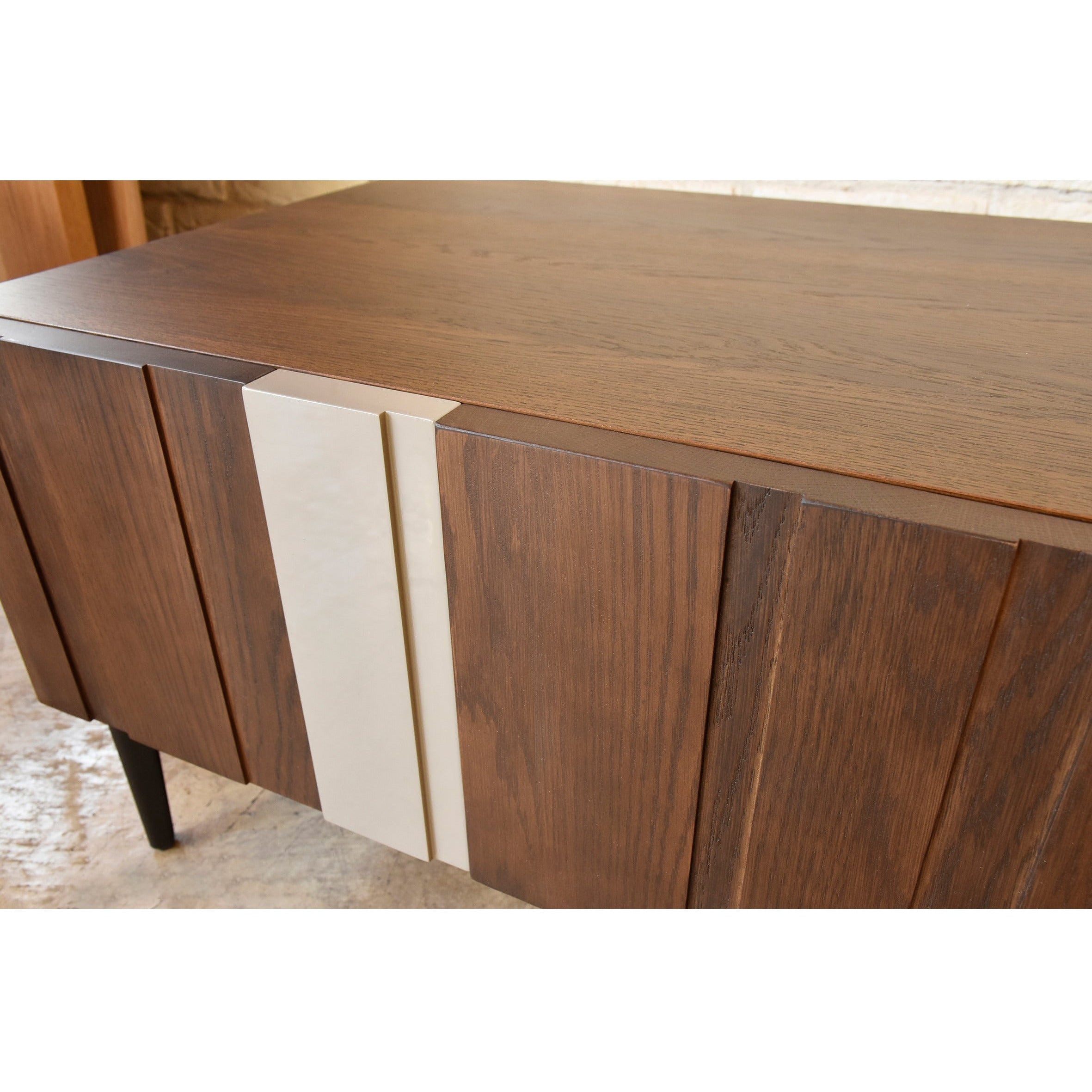 2種類の素材が美しく調和したテレビボード。お洒落な前板とブラックスチール脚が空間全体を引き締めます。前板はオーク無垢と光沢感のあるエナメル塗装仕上げのMDFを使用。無垢の木目と光沢感のあるグレー素材を組み合わせることで、重くなりすぎない程良い重厚感を演出します。収納はオープンと引出しの組み合わせなので、魅せる収納と隠す収納を使い分けることができます。引出しはスムーズな開閉ができるフルスライドレールを採用。奥までしっかりと引き出せるので、収納物の出し入れもしやすいです。